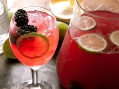 Ingredientes: Vino rosado, moras frescas, vodka, zumo de lima, rodajas de lima, hielo.